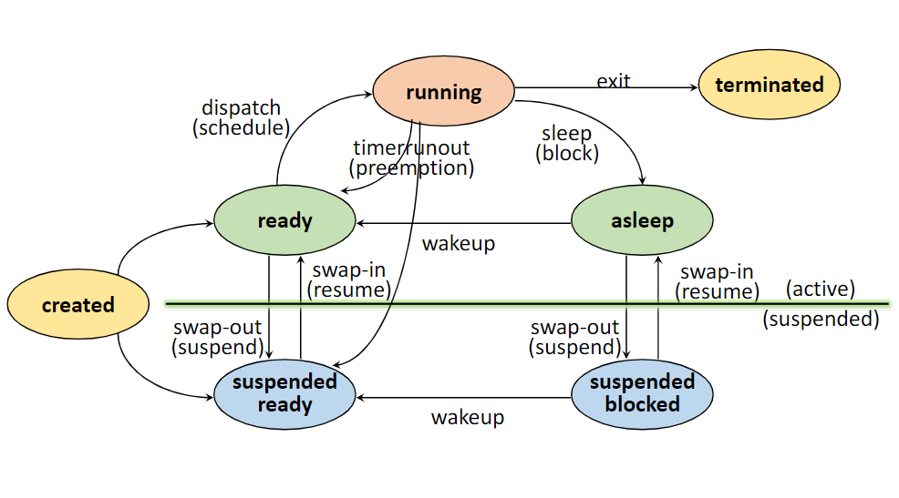 - 프로세서와 필요한 자원을 모두 할당 받은 상태