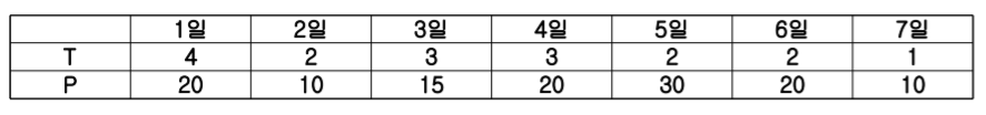 각각의 상담은 상담을 완료하는데 걸리는 날수 T와 상담을 했을 때 받을 수 있는 금액 P로 이 루어져 있다. 만약 N = 7이고, 아래와 같이 예약이 잡혀있다면