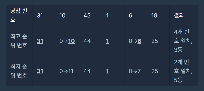 당첨 번호 6개가 31, 10, 45, 1, 6, 19라면, 당첨 가능한 최고 순위와 최저 순위의 한 예는 아래와 같습니다.