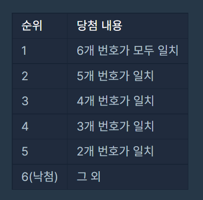 순서와 상관없이, 구매한 로또에 당첨 번호와 일치하는 번호가 있으면 맞힌 걸로 인정됩니다.