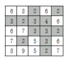 이제 위와 같은 지역에 많은 비가 내려서 높이가 4 이하인 모든 지점이 물에 잠겼다고 하자. 이 경우에 물에 잠기는 지점을 회색으로 표시하면 다음과 같다.