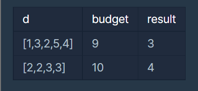 부서별로 신청한 금액이 들어있는 배열 d와 예산 budget이 매개변수로 주어질 때, 최대 몇 개의 부서에 물품을 지원할 수 있는지 return 하도록 solution 함수를 완성하기