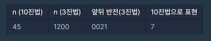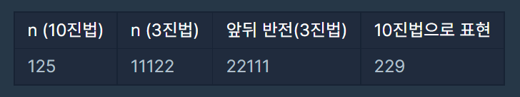 자연수 n이 매개변수로 주어집니다. n을 3진법 상에서 앞뒤로 뒤집은 후, 이를 다시 10진법으로 표현한 수를 return 하도록 solution 함수를 완성하기