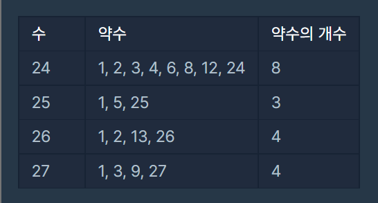 - 다음 표는 24부터 27까지의 수들의 약수를 모두 나타낸 것입니다.
