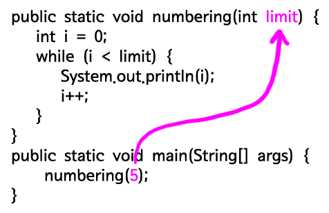 5는 인자(argument)이고, limit은 매개변수(parameter)이다.