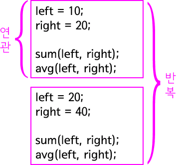 위의 예에서 변수 left와 right, 메소드 sum과 avg는 연관되어 있는 로직이다.