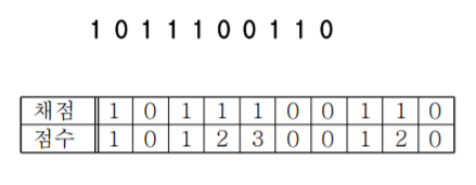 예를 들어, 아래와 같이 10 개의 OX 문제에서 답이 맞은 문제의 경우에는 1로 표시하고
