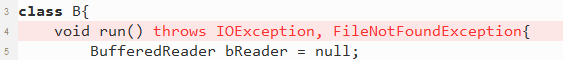 B 내부의 try...catch 구문은 제거되었고 run 옆에 throws IOException, FileNotFoundException이 추가되었다.