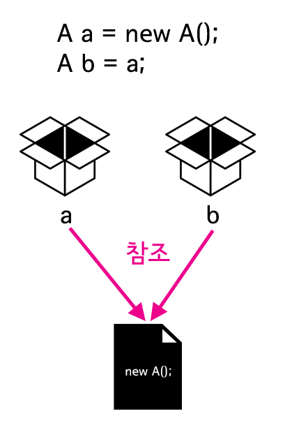 이것은 변수 b와 변수 a에 담긴 인스턴스가 서로 같다는 것을 의미하다.